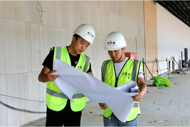 圖為閆雄雄(右)在施工現(xiàn)場對設(shè)計(jì)圖紙進(jìn)行交底