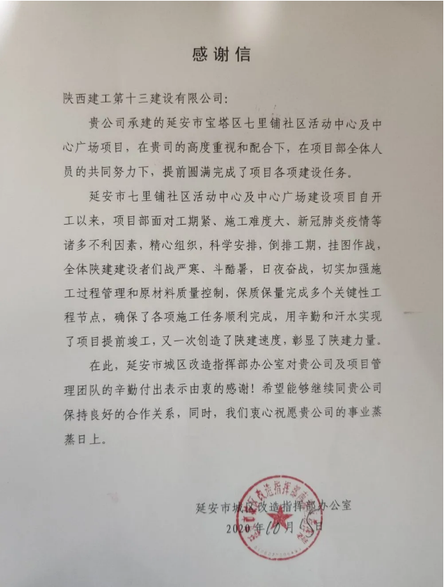 在繼南川河防洪工程、延安大學(xué)新校區(qū)體育中心項(xiàng)目之后,10月15日,公司負(fù)責(zé)施工的延安市七里鋪社區(qū)活動中心及中心廣場項(xiàng)目收到了來自建設(shè)單位的感謝信。延安市城區(qū)改造指揮部在感謝信中提到:陜建十三建公司延安寶塔區(qū)七里鋪社區(qū)活動中心及中心廣場項(xiàng)目全體建設(shè)者戰(zhàn)嚴(yán)寒、斗酷暑,日夜奮戰(zhàn),切實(shí)加強(qiáng)施工過程管理和質(zhì)量控制,保質(zhì)保量完成了多個關(guān)鍵性工程節(jié)點(diǎn),確保了各項(xiàng)施工任務(wù)順利完成,用辛勤和汗水實(shí)現(xiàn)了項(xiàng)目提前竣工,又一次創(chuàng)造了陜建速度,彰顯了陜建力量。