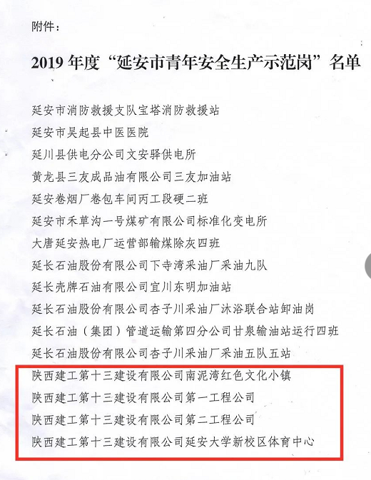 近日,共青團延安市委、延安市應(yīng)急管理局、延安市青年聯(lián)合會聯(lián)合下發(fā)《關(guān)于命名表彰2019年度延安市青年安全生產(chǎn)示范崗的決定》,陜建十三建公司第一工程公司、第二工程公司、南泥灣紅色文化小鎮(zhèn)項目部、延安大學(xué)新校區(qū)體育中心項目部四個集體榮獲2019年度“延安市青年安全生產(chǎn)示范崗”榮譽稱號。