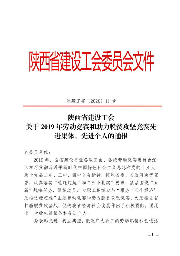 日前,陜西省建設(shè)工會通報表彰2019年勞動競賽和助力脫貧攻堅競賽先進(jìn)集體、先進(jìn)個人。陜建十三建公司工會委員會榮獲“2019年陜西省建設(shè)系統(tǒng)勞動競賽先進(jìn)集體”稱號。