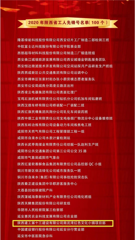 近日,陜西省三秦工匠、五一勞動獎(jiǎng)表彰大會在西安隆重舉行,會議表彰了2020年三秦工匠 和陜西省五一勞動獎(jiǎng)、工人先鋒號。陜西建工第十三建設(shè)有限公司南泥灣紅色文化小鎮(zhèn)項(xiàng)目部榮獲2020年“陜西省工人先鋒號”榮譽(yù)稱號。