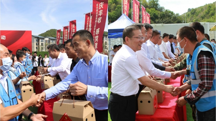 慰問活動現(xiàn)場,與會領(lǐng)導為農(nóng)民工朋友們發(fā)放慰問品,并隨后觀看了“慶豐收、感黨恩”慰問演出。