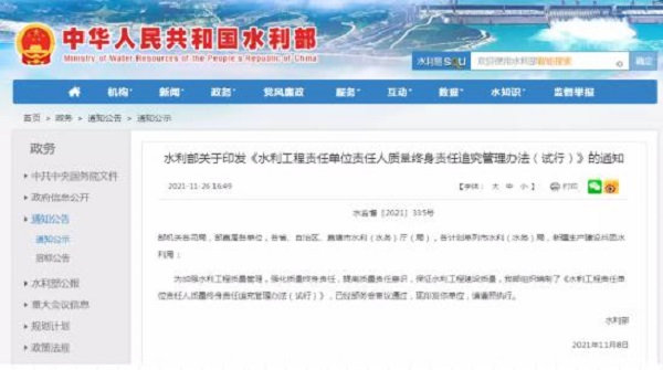 水利部關于印發(fā)《水利工程責任單位責任人質(zhì)量終身責任追究管理辦法(試行)》的通知