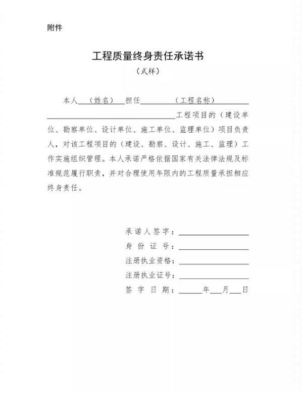 第十二條 項目負責人應當在辦理工程質(zhì)量監(jiān)督手續(xù)前簽署工程質(zhì)量終身責任承諾書(式樣參見附件),連同項目負責人證明材料,由建設單位(項目法人)報工程質(zhì)量監(jiān)督機構(gòu)備案。項目負責人如有更換的,應按前述規(guī)定重新備案。