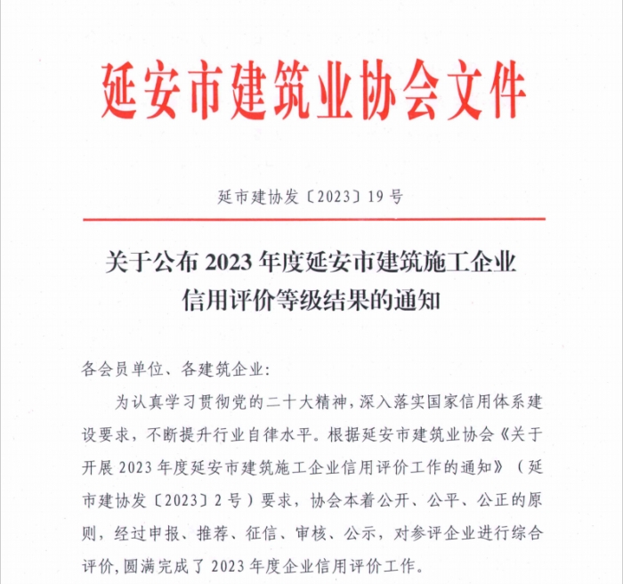 同時,延安市建協(xié)公布了2023年度延安市建筑施工企業(yè)信用評級結果:陜建十三建集團被評為AAA級企業(yè)。