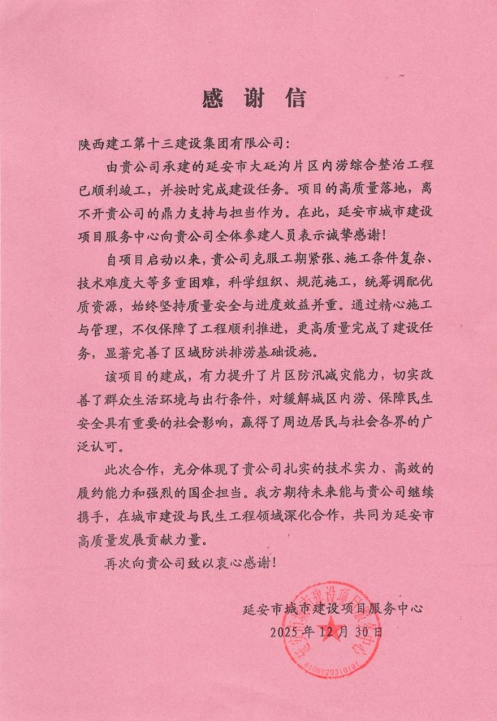 延安市城市建設(shè)項(xiàng)目服務(wù)中心向集團(tuán)致感謝信,充分肯定了集團(tuán)為延安市大砭溝內(nèi)澇綜合治理工程付出的艱辛努力與卓越貢獻(xiàn)。信中指出,自項(xiàng)目啟動(dòng)以來(lái),集團(tuán)在克服工期緊張,施工條件復(fù)雜,技術(shù)難度大等多重因素,科學(xué)組織、規(guī)范實(shí)施,統(tǒng)籌調(diào)配優(yōu)質(zhì)資源,高質(zhì)量完成建設(shè)任務(wù),顯著完善了區(qū)域防洪排澇基礎(chǔ)設(shè)施。充分彰顯了集團(tuán)扎實(shí)的技術(shù)實(shí)力,高效的履約能力和強(qiáng)烈的國(guó)企擔(dān)當(dāng),贏得了周邊居民和社會(huì)各界的廣泛認(rèn)可。
