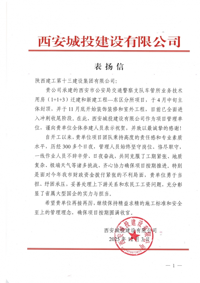 西安城投建設(shè)有限公司向集團(tuán)致表?yè)P(yáng)信,對(duì)集團(tuán)承建的西安市公安局交通警察支隊(duì)車(chē)管所業(yè)務(wù)技術(shù)用房(1+1+3)拆遷和新建工程─東區(qū)分所項(xiàng)目致以表?yè)P(yáng)。信中指出,項(xiàng)目歷經(jīng)300多個(gè)日夜,建設(shè)人員不辭辛勞、日夜奮戰(zhàn),克服工期緊張、地質(zhì)復(fù)雜、極端天氣等諸多挑戰(zhàn),齊心協(xié)力推進(jìn)項(xiàng)目順利實(shí)施。特別在面對(duì)資金緊張,集團(tuán)勇于擔(dān)當(dāng)、紓困承壓,積極協(xié)調(diào)各方關(guān)系,穩(wěn)妥處理農(nóng)民工工資問(wèn)題,充分彰顯了國(guó)有企業(yè)的實(shí)力與擔(dān)當(dāng)。希望集團(tuán)能繼續(xù)保持精益求精的施工標(biāo)準(zhǔn)和安全生產(chǎn)保障,確保項(xiàng)目按期圓滿收官。
